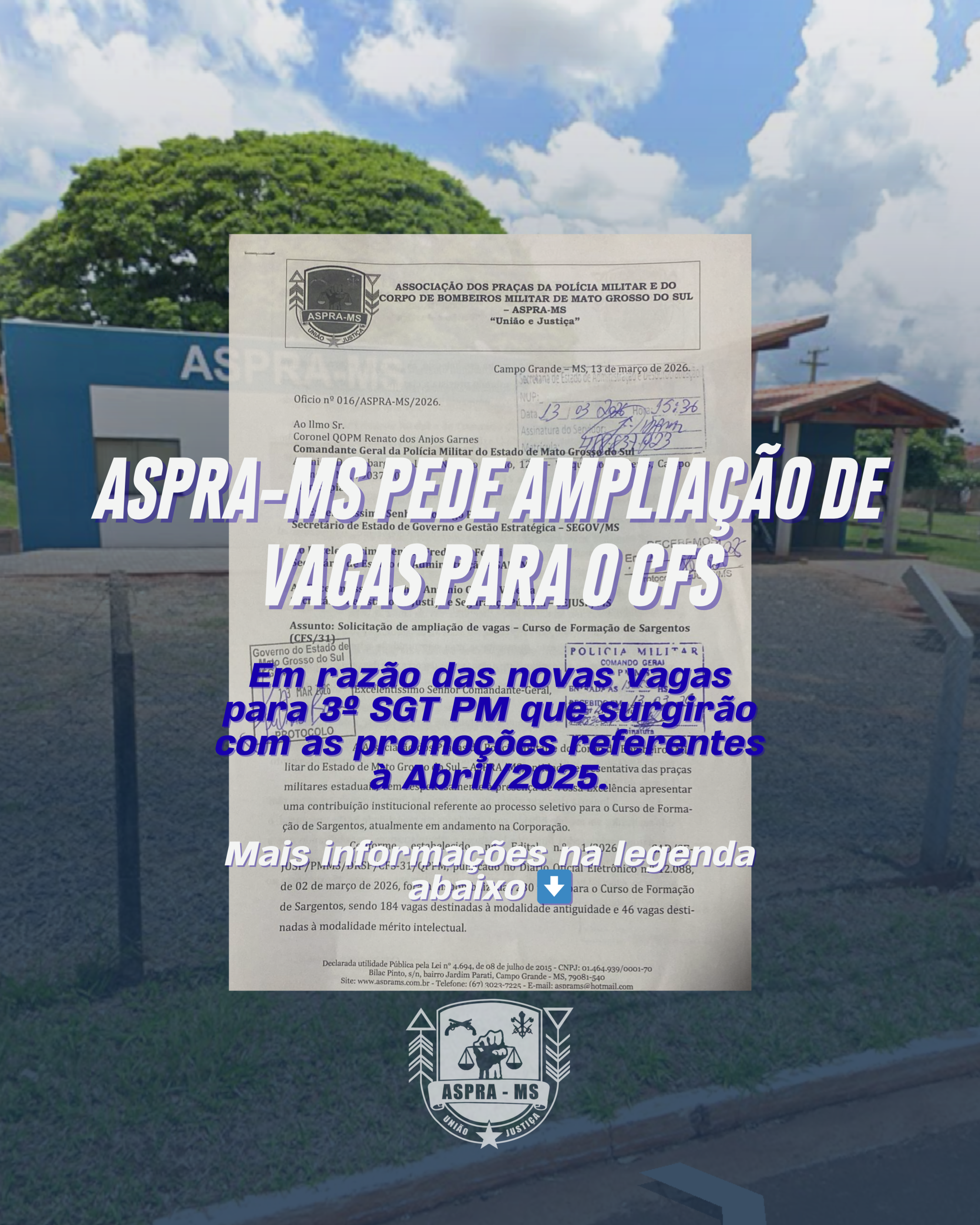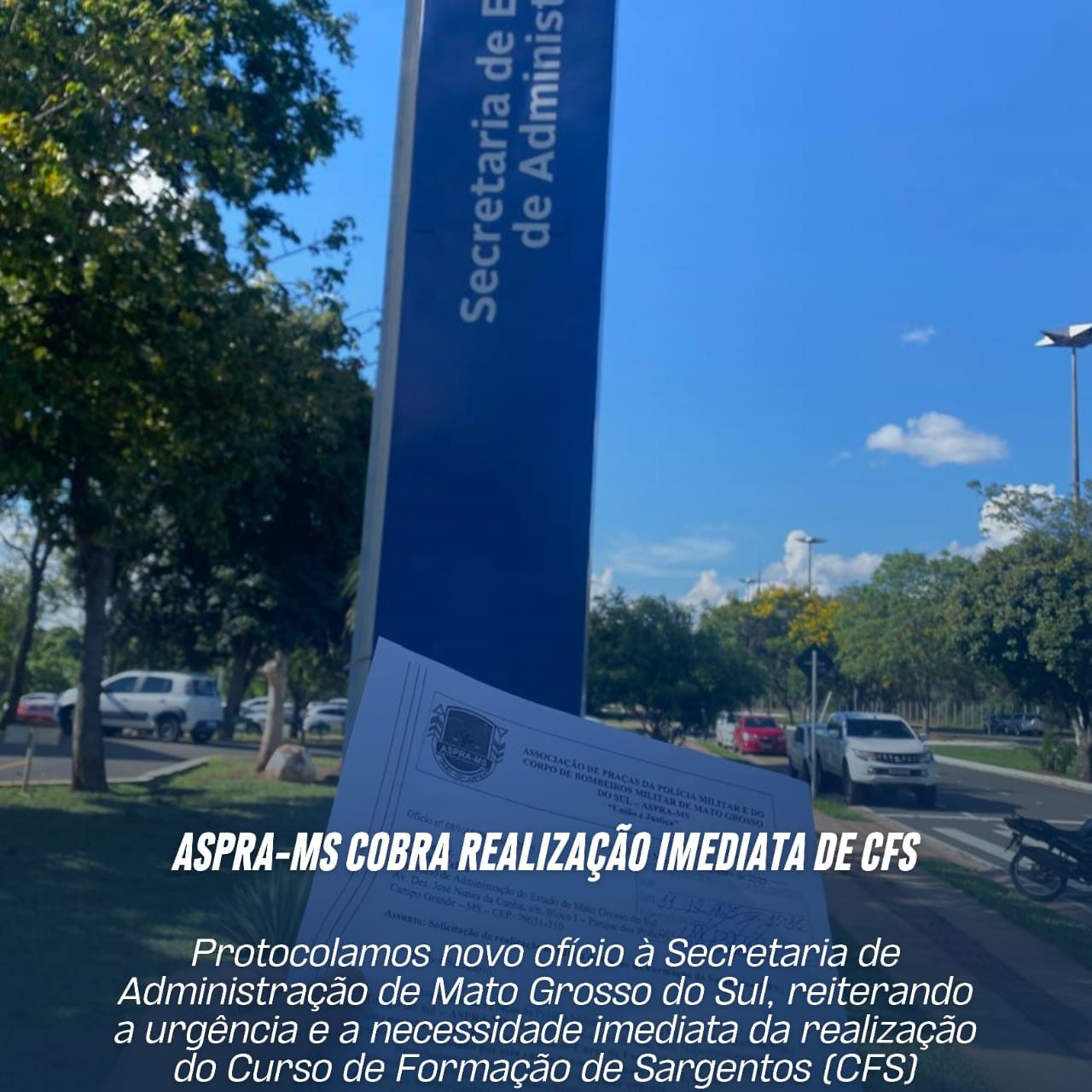 A ASPRA-MS protocolou ofício junto ao Comando-Geral da Polícia Militar de Mato Grosso do Sul, com cópia às Secretarias de Governo, Administração e Justiça e Segurança Pública, solicitando