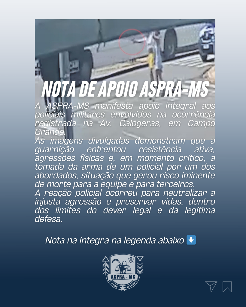 A Associação dos Praças da Polícia Militar e do Corpo de Bombeiros Militar de Mato Grosso do Sul (ASPRA-MS) vem a público manifestar apoio integral aos policiais militares envolvidos na ocorrência registrada na Avenida Calógeras, em Campo Grande, que resultou na morte de uma pessoa após intervenção policial.